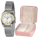 DESCRIÇÃO DO PRODUTO: Caixa: MetalPulseira: Malha de Aço MeshMedida da caixa: 30 mmVidro: Cristal MineralResistência à água: 50mFunções: AnalógicoMostrador Estilo Madreperola Branca com todos os númerosFundo de PressãoAlimentação do Maquinário: BateriaMaquinário Japonês+ Estojo Porta Jóias LinceDourado com PrateadoGarantia de 1 Ano