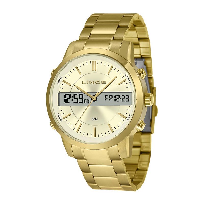 Relógios Lince se notabilizando pela concepção e construção de artigos com qualidade e beleza. Marca: Lince Gênero: Masculino Visor: Champanhe Vidro: Cristal mineral Resiste à água: 5ATM Caixa: Aço Cor da Caixa: Dourado Pulseira: Aço Cor da Pulseira: Dourado Características: Calendário, anadigi.