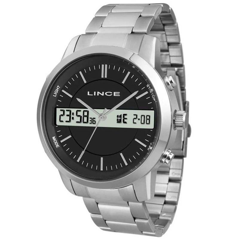 Relógios Lince se notabilizando pela concepção e construção de artigos com qualidade e beleza. Marca: Lince Gênero: Masculino Visor: Preto Vidro: Cristal mineral Resiste à água: 5ATM Caixa: Aço Pulseira: Aço Características: Analógico, digital, calendário, cronógrafo, alarme