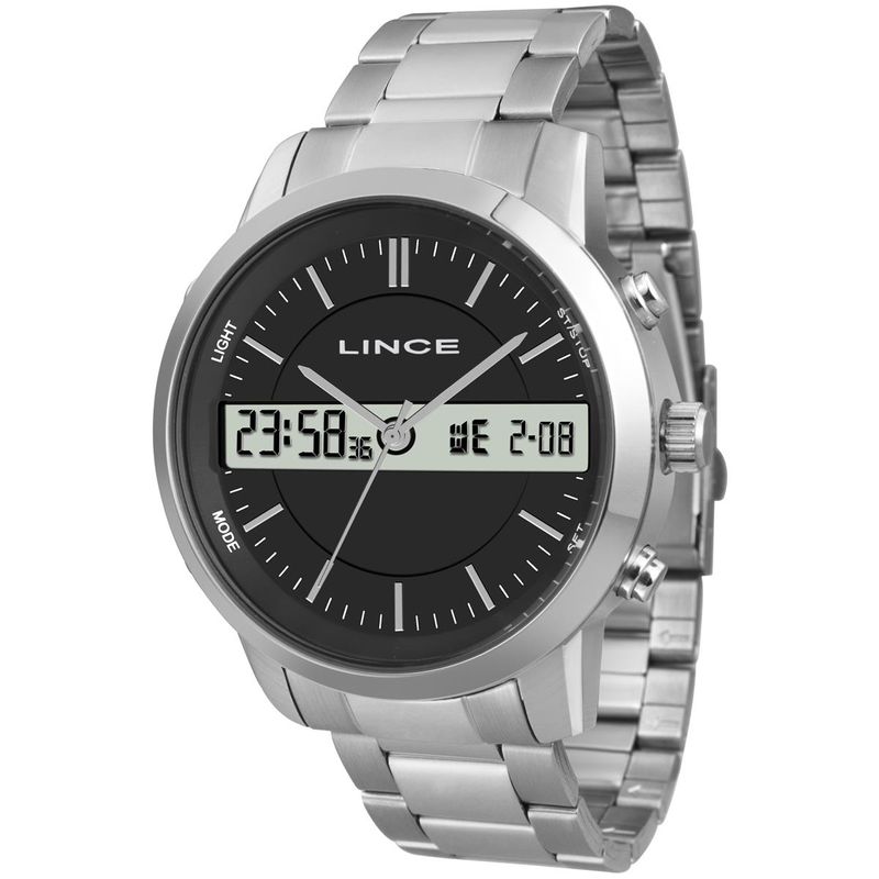 DESCRIÇÃO DO PRODUTO: Marca: LinceGênero: MasculinoVidro: Cristal MineralFunções: Anadigi, Calendário, Cronógrafo, Alarme, IluminaçãoResistência à Água: 50 mCaracterísticas: com caixa metal e pulseira de Aço InoxidávelDiâmetro da Caixa: 46 mmFundo ParafusadoAlimentação do Maquinário: BateriaMostrador PretoGarantia de 1 ano