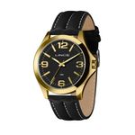 Gênero: MasculinoVidro: Cristal MineralFunções: AnalógicoResistência à Água: 50 mCaracterísticas: com caixa metal e pulseira de material ecológico PretoDiâmetro da Caixa: 46 mmFundo de PressãoAlimentação do Maquinário: BateriaMostrador preto com números e detalhes em dourado