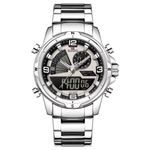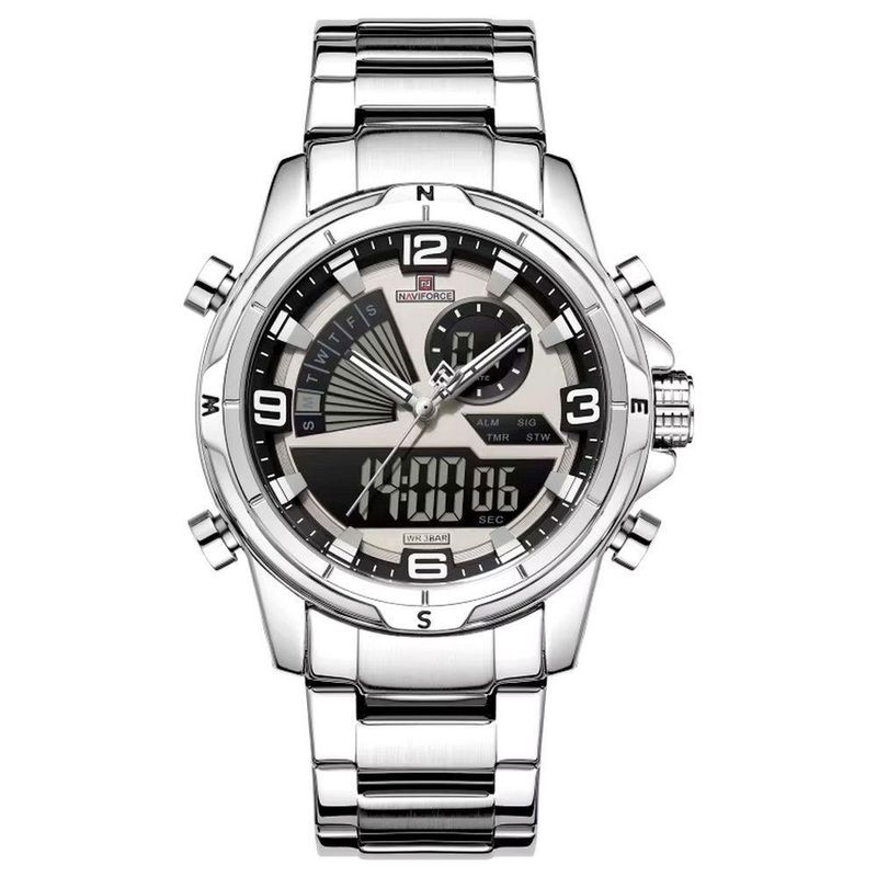 Relógio Masculino Clássico Multifuncional Duplo Display Quartzo Impermeavel PrataO relógio masculino clássico multifuncional da Naviforce traz um toque de sofisticação e funcionalidade para o seu dia a dia. Projetado para homens que buscam estilo e praticidade, este relógio oferece um duplo display, analógico e digital, que permite uma leitura fácil e rápida das horas. Seu design robusto é complementado por funções modernas como alarme e modo de contagem regressiva, tornando-o perfeito para diversas ocasiões, desde reuniões de trabalho até atividades esportivas.Com uma espessura de estojo de 16mm e um diâmetro de visor que varia entre 40mm e 44mm, este acessório de pulso é tanto funcional quanto estiloso. A pulseira de aço inoxidável confere durabilidade, enquanto o vidro Hardlex protege contra arranhões. Seu movimento de quartzo garante precisão, enquanto a resistência à água de até 3 Bar oferece segurança e tranquilidade, seja em dias chuvosos ou durante atividades aquáticas. Especificações: [Resistente e durável] Com uma construção robusta utilizando aço inoxidável, este relógio é feito para durar, resistindo ao desgaste diário sem sacrificar a elegância. [Design moderno] O formato redondo clássico do estojo e o mostruário analógico-digital oferecem um equilíbrio perfeito entre tradição e modernidade. [Funções inteligentes] Equipado com luz de fundo, cronômetro e tela de LED, é ideal para quem exige mais do que apenas um acessório de moda. [Conforto e ajuste] A largura da banda varia entre 20mm e 24mm, proporcionando conforto e um ajuste seguro. O fecho de bracelete garante um encaixe perfeito no pulso sem comprometer o estilo. [Precisão confiável] O movimento de quartzo garante que você nunca perca um momento, com uma bateria que garante durabilidade e confiabilidade.