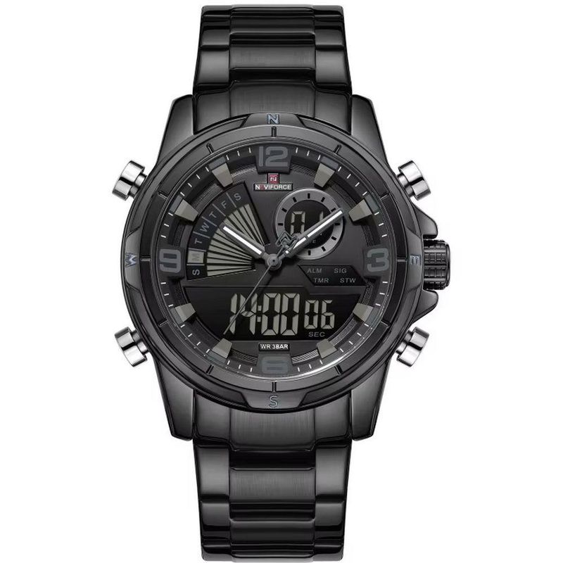 Relógio Masculino Clássico Multifuncional Duplo Display Quartzo Impermeavel PretoO relógio masculino clássico multifuncional da Naviforce traz um toque de sofisticação e funcionalidade para o seu dia a dia. Projetado para homens que buscam estilo e praticidade, este relógio oferece um duplo display, analógico e digital, que permite uma leitura fácil e rápida das horas. Seu design robusto é complementado por funções modernas como alarme e modo de contagem regressiva, tornando-o perfeito para diversas ocasiões, desde reuniões de trabalho até atividades esportivas.Com uma espessura de estojo de 16mm e um diâmetro de visor que varia entre 40mm e 44mm, este acessório de pulso é tanto funcional quanto estiloso. A pulseira de aço inoxidável confere durabilidade, enquanto o vidro Hardlex protege contra arranhões. Seu movimento de quartzo garante precisão, enquanto a resistência à água de até 3 Bar oferece segurança e tranquilidade, seja em dias chuvosos ou durante atividades aquáticas. Especificações: [Resistente e durável] Com uma construção robusta utilizando aço inoxidável, este relógio é feito para durar, resistindo ao desgaste diário sem sacrificar a elegância. [Design moderno] O formato redondo clássico do estojo e o mostruário analógico-digital oferecem um equilíbrio perfeito entre tradição e modernidade. [Funções inteligentes] Equipado com luz de fundo, cronômetro e tela de LED, é ideal para quem exige mais do que apenas um acessório de moda. [Conforto e ajuste] A largura da banda varia entre 20mm e 24mm, proporcionando conforto e um ajuste seguro. O fecho de bracelete garante um encaixe perfeito no pulso sem comprometer o estilo. [Precisão confiável] O movimento de quartzo garante que você nunca perca um momento, com uma bateria que garante durabilidade e confiabilidade.