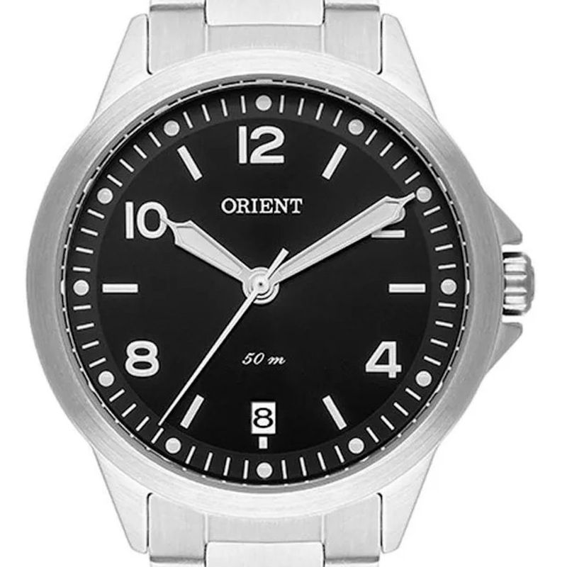 Referência ORIENT do Brasil FBSS1159 P2SX Relógio movido à bateria / sistema de energia quartz Mecanismo Analógico Calendário dia do mês Vidro de cristal mineral Caixa do relógio em aço inox prata ulseira de aço inox prata Fecho em aço inox prata Mostrador preto Tampa posterior rosqueada Resistência à água 50M