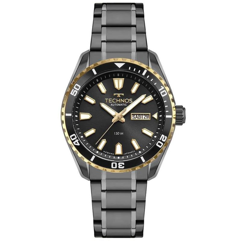 O Technos Automático Diver apresenta o design clássico de mergulho, inspirado nos modelos lançados pela Technos na década de 70, que fizeram história no Brasil. Com resistência à água de 150 metros, o modelo também apresenta elementos fundamentais para aventuras submersas, como o aro externo giratório unidirecional com acabamento corrugado e mostrador azul com efeito luminescente nos ponteiros e marcadores de hora, além dos marcadores de hora em formas geométricas, fator que facilita a leitura das horas. Seu sistema de impermeabilização é configurado pela tripla colocação na coroa, além da coroa ser rosqueada para oferecer ainda mais segurança ao mergulhar. Compre online seu Relógio Masculino Technos Automático 8205PC/1P original. Acompanha certificado de garantia, estojo e manual. Enviamos para todo o Brasil. Referência de Fábrica: 8205PC/1P Marca: Technos Tamanho da caixa: 43mm Cor da caixa: Grafite Cor da pulseira: Grafite Cor do mostrador: Preto Mecanismo: Automático Material da Pulseira: Aço Inox Material da Caixa: Aço Inox Nível de Resistência à Água: 15 Atm Todos os relógios são originais! Acompanham certificado de garantia do fabricante, estojo, manual em português e nota fiscal. Veja mais modelos de Relógios Masculinos.
