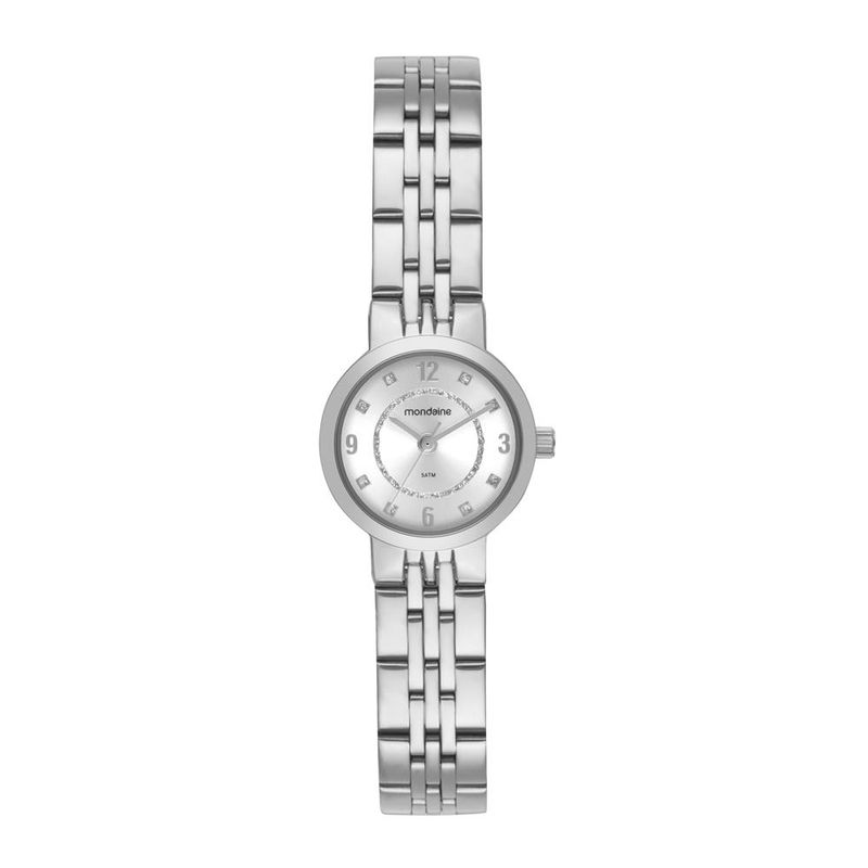 DESCRIÇÃO DO PRODUTO: Caixa de MetalPulseira de AçoVidro de Cristal MineralFundo RosqueadoResistente à Água 5 AtmDiâmetro / Largura da Caixa: 24.00 MMFunção: AnalógicoAlimentação do Maquinário: BateriaMostrador prateado com números e pedrasGarantia de 1 Ano