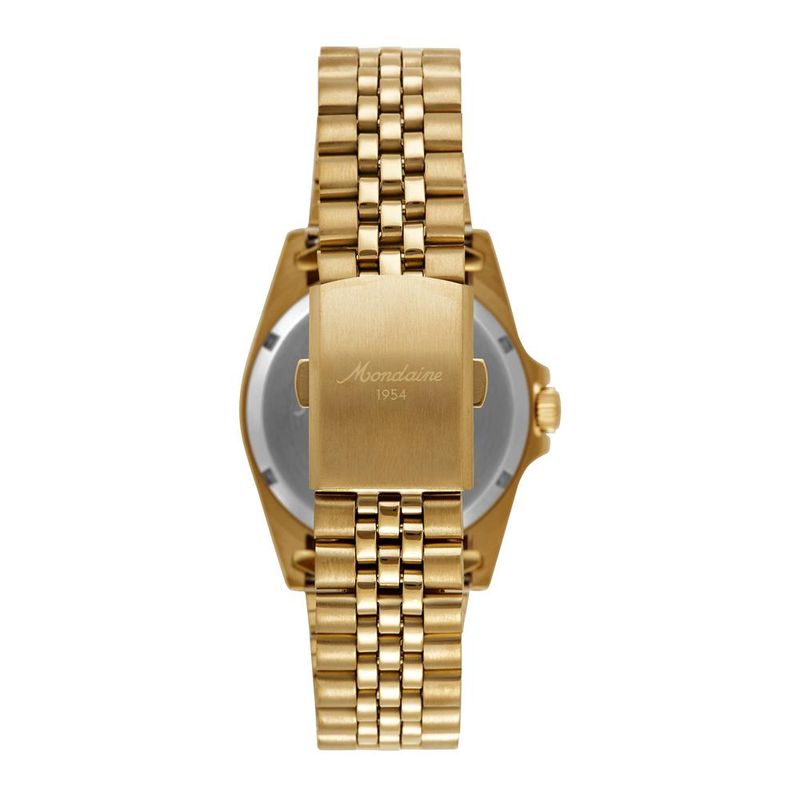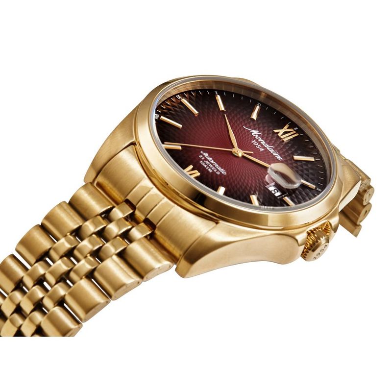 DESCRIÇÃO DO PRODUTO: Caixa de Aço InoxidávelPulseira de Aço InoxidávelVidro de Cristal MineralFundo RosqueadoResistente à Água 10 AtmDiâmetro / Largura da Caixa: 40.00 MMAltura da Caixa: 12.00 MMFunção: Automático, Calendário com lupaMostrador Vinho Degradê com Algarismos Romanos e Inscrição Mondaine 1954 (Logo Clássica da marca)Alimentação do Maquinário: Mecânico (Automático)Garantia de 1 Ano