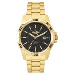Descrição do Produto: Caixa de Aço InoxidávelPulseira de Aço InoxidávelFundo de Pressão em AçoResistente à Água 5 ATMDiâmetro / Largura da Caixa: 44.00 MMFunções: Analógico, CalendárioVidro: Cristal MineralAro Fixo Dourado com números (indicadores dos minutos)Alimentação do maquinário BateriaMostrador PretoMaquinário JaponêsGarantia de 1 Ano