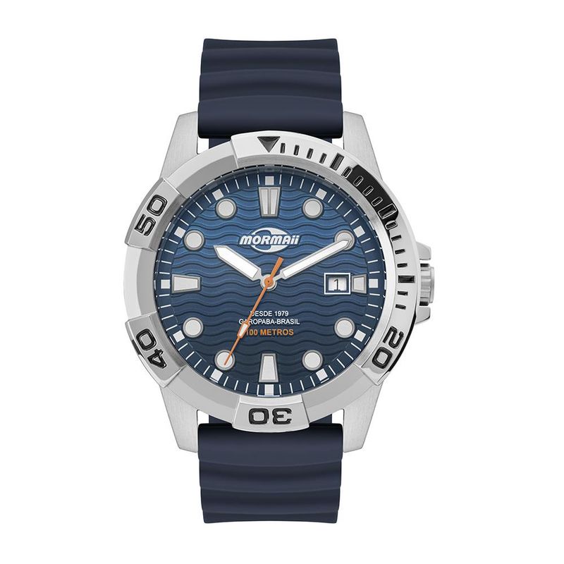 Descrição do Produto: Caixa de Aço InoxidávelPulseira de Silicone AzulFundo de Aço RosqueadoResistente à Água 10 ATMDiâmetro / Largura da Caixa: 44.00 MMFunções: Analógico, CalendárioVidro: Cristal MineralAro Fixo Prateado com números (indicadores dos minutos)Alimentação do maquinário BateriaMostrador Azul com detalhes em alto relevoMaquinário JaponêsGarantia de 1 Ano