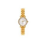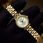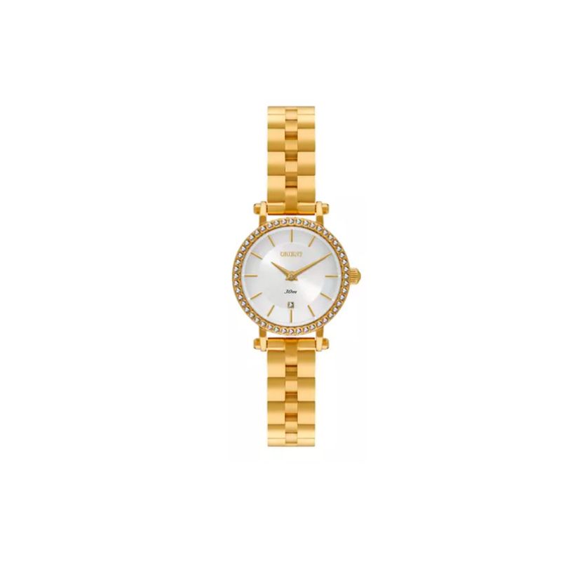 CARACTERÍSTICAS:- Caixa redonda em aço inoxidável na cor dourado- Mostrador na cor prata- Pulseira em aço- Fecho de pressão- Vidro em cristal mineral- Resistência a água de até 3 atm ou 30 metros- Fundo de fechamento a pressão- Coroa simples (não rosqueada)- Alimentação a bateria- Manual em português- Medidas da caixa:- 24 mm de largura sem a coroa- 26 mm de largura com a coroa- 30 mm de altura (lug to lug)- 7 mm de espessura- Peso: 45 gramas