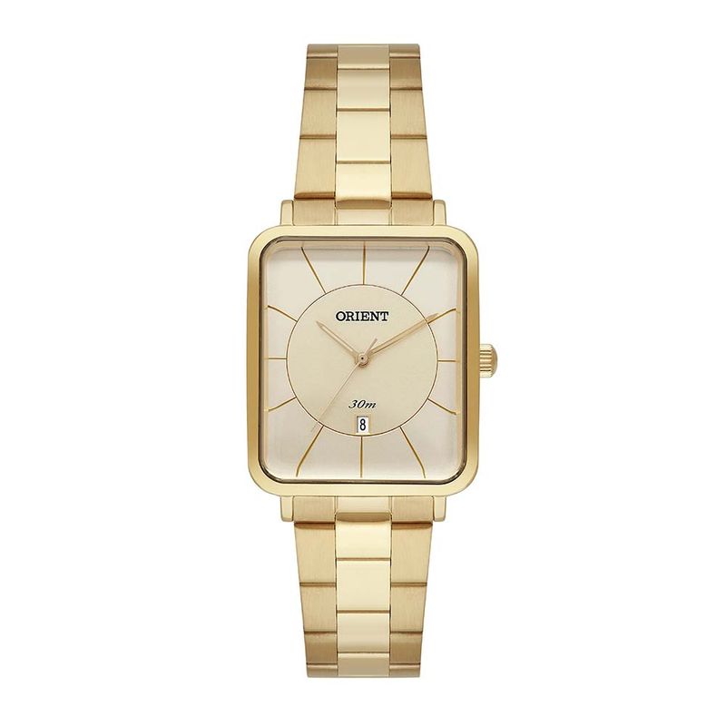 Relógios Orient. Fundada em julho de 1950, a Orient é representante da tradição japonesa na arte de fazer relógios, se notabilizando pela concepção e construção de artigos com qualidade e beleza. Marca: Orient Gênero: Feminino Visor: Champanhe Vidro: Cristal mineral Resiste à água: 3ATM Diâmetro da Caixa: 26,9x31mm Caixa: Aço + ipg Cor da Caixa: Dourado Pulseira: Aço + ipg Cor da Pulseira: Dourado Características: Calendário