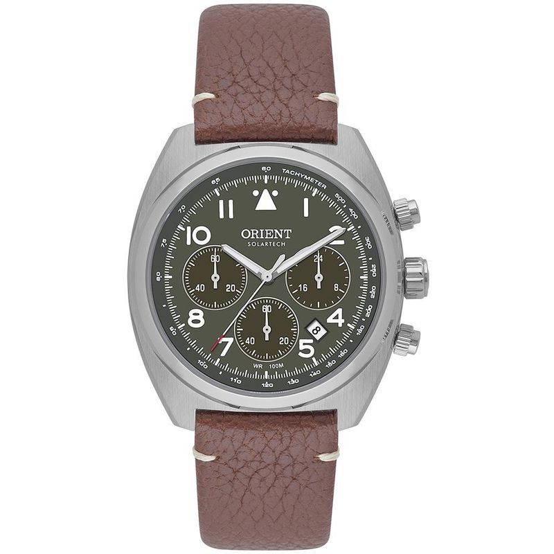 DESCRIÇÃO DO PRODUTO: Vidro: SafiraFunções: Calendario, Analógico, Solar, Cronógrafo, TaquímetroResistencia à água: 100 MCaracterísticas: com caixa Aço inoxidável e pulseira Couro Legítimo MarromDiâmetro da caixa: 3,8 cmAlimentação do Maquinário: Energia SolarMostrador verde com númerosFundo RosqueadoLinha: Orient SolartechGarantia de 1 ano