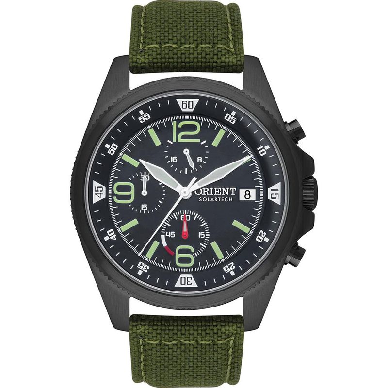 DESCRIÇÃO DO PRODUTO: Vidro: Cristal MineralFunções: Calendario, Analógico, Solar, CronógrafoResistencia à água: 100 MCaracterísticas: com caixa Aço inoxidável e pulseira Couro Legítimo revestida de Nylon Verde Militar Diâmetro da caixa: 4,5 cmAlimentação do Maquinário: Energia SolarMostrador Preto com Número e detalhes em vermelho e verdeFundo RosqueadoLinha: Orient SolartechGarantia de 1 ano