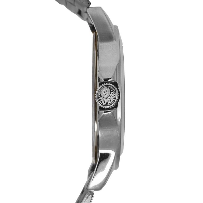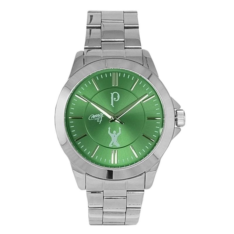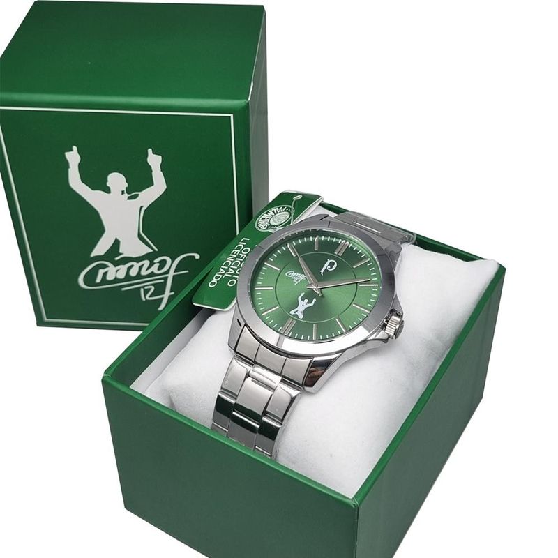 DESCRIÇÃO DO PRODUTO: Caixa de MetalPulseira de AçoFundo de PressãoVidro de Cristal MineralResistência à água: 5 atmDiâmetro da caixa: 45.00 MMFunções: AnalógicoAlimentação do maquinário: BateriaTema: Clube de FutebolMostrador Verde com simbolo do Palmeiras e Assinatura do Goleiro MarcosRelógio Oficial do VerdãoEdição Especial Comemorativa Goleiro Marcos 12Garantia de 1 anoPRODUTO OFICIAL LICENCIADO SOCIEDADE ESPORTIVA PALMEIRAS