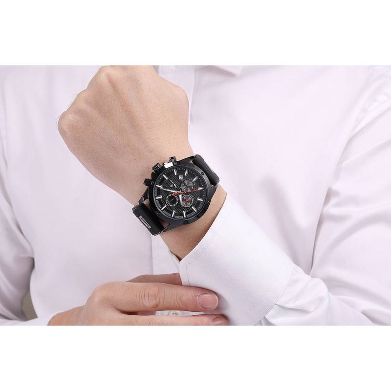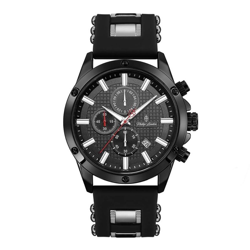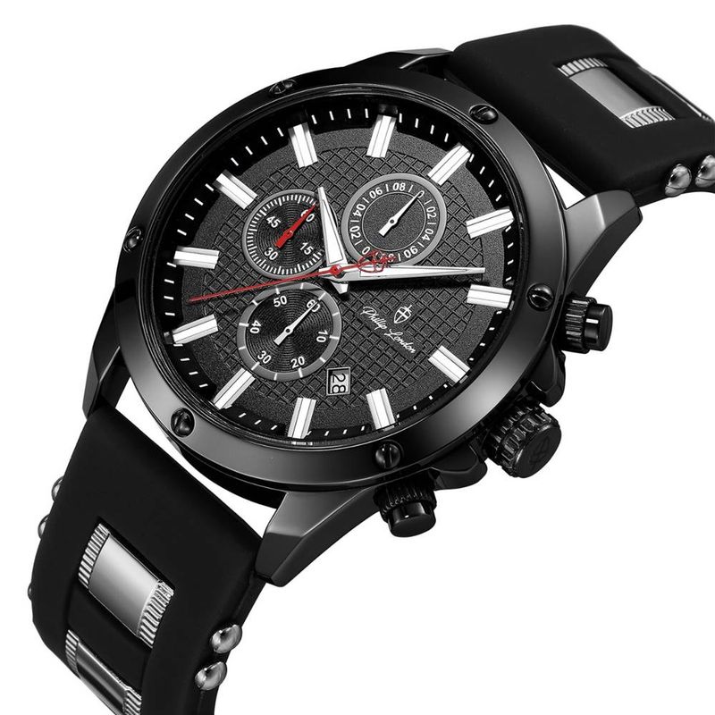 DESCRIÇÃO DO PRODUTO: Caixa de MetalPulseira de Silicone PretaVidro de Cristal MineralFundo RosqueadoResistente à Água 5 AtmDiâmetro / Largura da Caixa: 45.00 MMFunções: Analógico, Cronógrafo, CalendárioDesign InglêsEstilo: Esporte FinoLinha: Phillip London FalconMostrador Preto com detalhes em prateadoAlimentação do Maquinário: Bateria Garantia de 1 ano