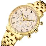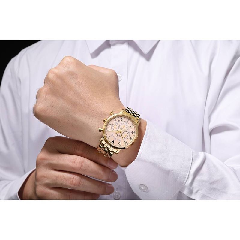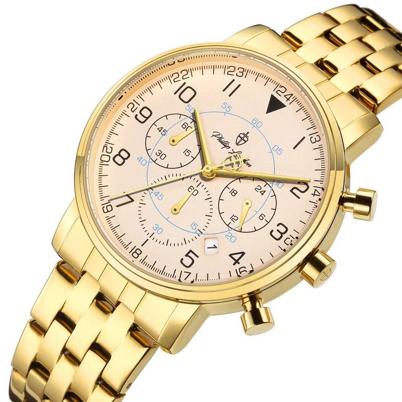 DESCRIÇÃO DO PRODUTO: Caixa de MetalPulseira de AçoVidro de Cristal MineralFundo RosqueadoResistente à Água 5 AtmDiâmetro / Largura da Caixa: 40.00 MMFunções: Analógico, Cronógrafo, CalendárioDesign InglêsEstilo: Esporte FinoLinha: Phillip London ChurchillMostrador Champanhe com NúmerosAlimentação do Maquinário: Bateria Garantia de 1 ano
