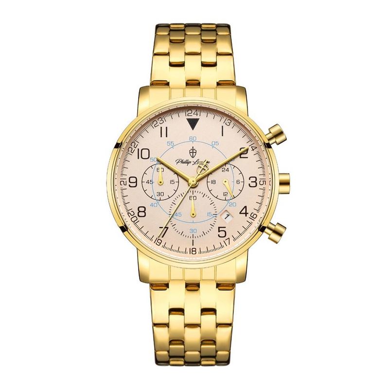 DESCRIÇÃO DO PRODUTO: Caixa de MetalPulseira de AçoVidro de Cristal MineralFundo RosqueadoResistente à Água 5 AtmDiâmetro / Largura da Caixa: 40.00 MMFunções: Analógico, Cronógrafo, CalendárioDesign InglêsEstilo: Esporte FinoLinha: Phillip London ChurchillMostrador Champanhe com NúmerosAlimentação do Maquinário: Bateria Garantia de 1 ano