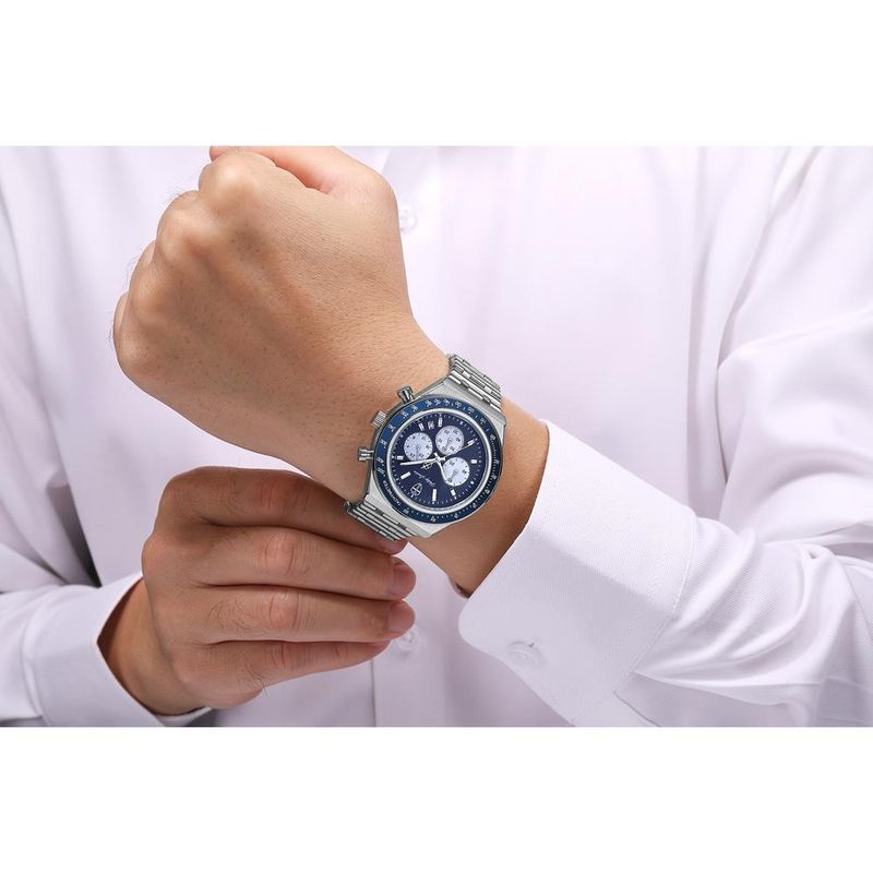 DESCRIÇÃO DO PRODUTO: Caixa de MetalPulseira de Aço InoxVidro de Cristal MineralFundo RosqueadoResistente à Água 5 AtmDiâmetro / Largura da Caixa: 43.00 MMFunções: Analógico, Cronógrafo, CalendárioDesign InglêsEstilo: Esporte FinoMostrador Azul Escuro com detalhes em prateadoAro Fixo Azul Escuro com TaquímetroAlimentação do Maquinário: Bateria Garantia de 1 ano