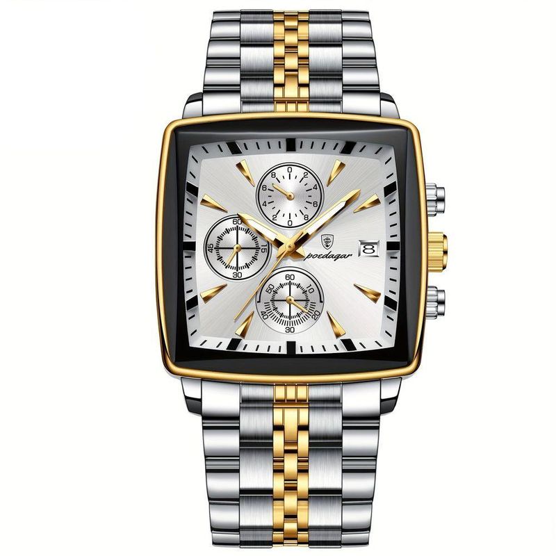 Relógio Quadrado Em Aço Inoxidável Para Homens Com Cronógrafo À Prova Da Água Branco DouradoDescubra o requinte e a sofisticação com este é uma verdadeira obra-prima para homens que desejam marcar presença em qualquer ocasião. Este acessório não é apenas um cronógrafo À Prova Da Água, mas um símbolo de estilo com seu impressionante mostrador azul e detalhes dourados. Projetado tanto para eventos formais quanto para encontros casuais, este relógio se destaca pela sua elegância incomparável e precisão proporcionada pelo movimento de quartzo. Seja participando de uma reunião importante ou desfrutando de um jantar íntimo, este relógio em aço inoxidável é a escolha perfeita para afirmar seu estilo e personalidade. Especificações: [Faixa etária aplicável] Este relógio é ideal para homens que desejam um toque de elegância em seu dia a dia. [Material da correia] Feito de aço inoxidável, garantindo durabilidade e um brilho que se mantém impecável ao longo do tempo. [Material do estojo de relógios] Possui caixa feita de liga, proporcionando resistência sem abrir mão do design sofisticado. [Estilo e Movimento] Com um design elegante e o confiável movimento de quartzo, este relógio combina estilo com precisão. [Fonte de energia] Este relógio é alimentado por uma bateria tipo botão, assegurando funcionamento contínuo e de baixa manutenção.