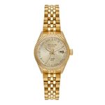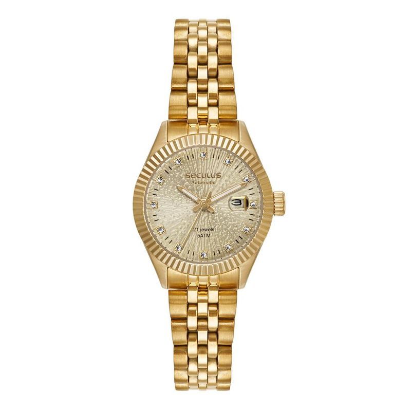 DESCRIÇÃO DO PRODUTO: Vidro: Cristal MineralFunções: Automático, Analógico, Calendário com LupaResistencia à água: 50 MCaracterísticas: com caixa de Aço inoxidável e pulseira de Aço InoxidávelDiâmetro da caixa: 2,8 cmFundo RosqueadoCom fundo de vidro que permite a visualização do maquinário em funcionamentoLinha: Seculus AutomaticAlimentação do Maquinário: Mecânico (Automático, Corda).Mostrador Dourado com pedrasAro Fixo corrugadoGarantia de 2 anos