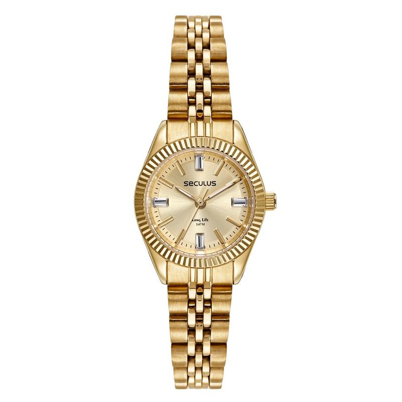 DESCRIÇÃO DO PRODUTO: Vidro: Cristal MineralFunções: AnalógicoResistencia à água: 50 MCaracterísticas: com caixa de Aço e pulseira de AçoDiâmetro da caixa: 2,4 cmFundo RosqueadoAlimentação do Maquinário: BateriaMostrador Dourado com pedrasLinha: Seculus Long LifeGarantia de 2 anos