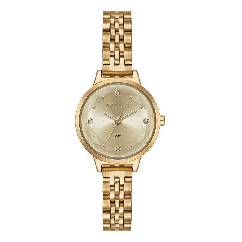 DESCRIÇÃO DO PRODUTO: Vidro: Cristal Mineral FacetadoFunções: AnalógicoResistencia à água: 50 MCaracterísticas: com caixa de Metal Especial e pulseira de Aço InoxidávelDiâmetro da caixa: 2,8 cmFundo RosqueadoAlimentação do Maquinário: BateriaMostrador Dourado com pedrasMovimento JaponêsGarantia de 2 anos