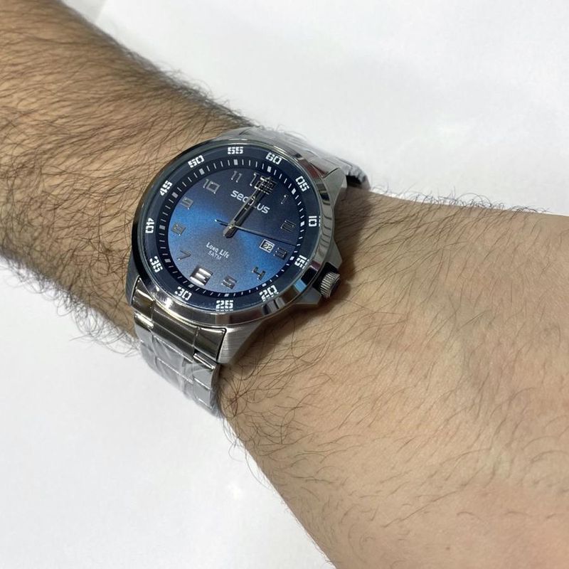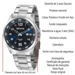 DESCRIÇÃO DO PRODUTO: Vidro: Cristal MineralFunções: Analógico, CalendárioResistencia à água: 50 MCaracterísticas: com caixa de Aço inoxidável e pulseira de Aço InoxidávelDiâmetro da caixa: 4,6 cmFundo de RoscaLinha Long LifeAlimentação do Maquinário: BateriaMostrador azul com todos os números (fácil para ver as horas)Garantia de 2 anos