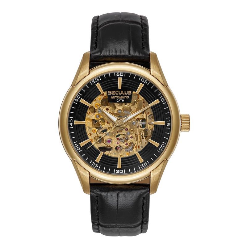 DESCRIÇÃO DO PRODUTO: Vidro: Cristal MineralFunções: Automático Esqueleto, AnalógicoResistencia à água: 100 MCaracterísticas: com caixa de Aço inoxidável e pulseira de Couro Legítimo PretoDiâmetro da caixa: 4,0 cmFundo RosqueadoMaquinário DouradoCom fundo de vidro que permite a visualização do maquinário em funcionamentoLinha: Seculus AutomaticAlimentação do Maquinário: Mecânico (Automático, Corda).Mostrador Preto com detalhe que permite a visualização do maquinárioGarantia de 2 anos
