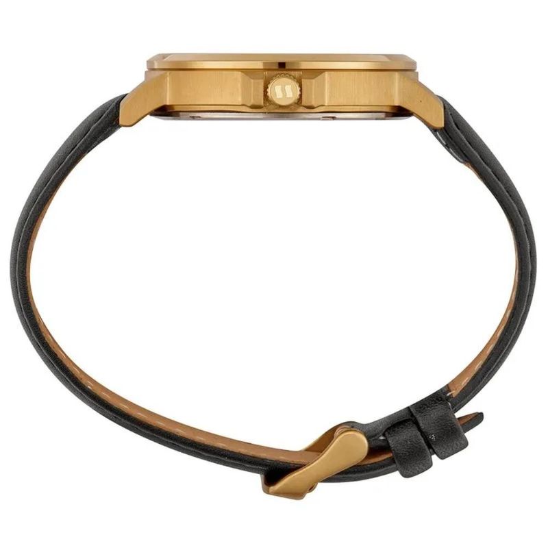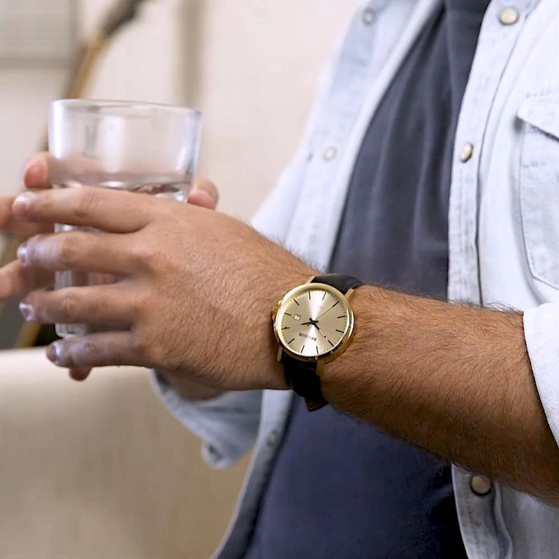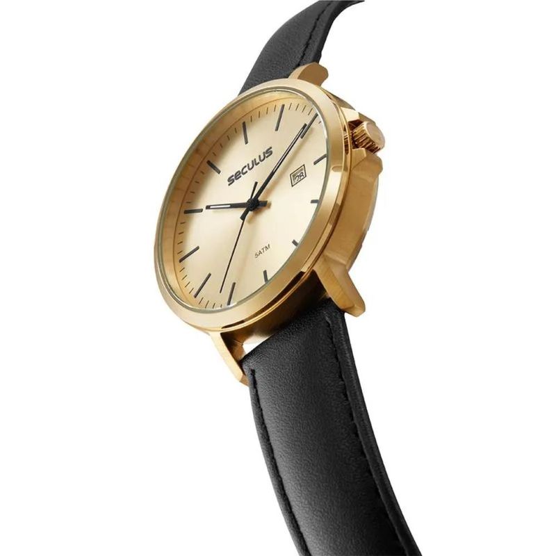 DESCRIÇÃO DO PRODUTO: Vidro: Cristal MineralFunções: Analógico, CalendárioResistencia à água: 50 MCaracterísticas: com caixa de Aço inoxidável e pulseira de Couro Legítimo PretoDiâmetro da caixa: 4,2 cmFundo de RoscaAlimentação do Maquinário: BateriaMostrador DouradoGarantia de 2 anos