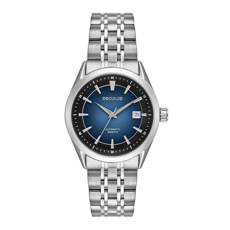 DESCRIÇÃO DO PRODUTO: Vidro: Cristais de SafiraFunções: Automático, Analógico, CalendárioResistencia à água: 50 MCaracterísticas: com caixa de Aço inoxidável e pulseira de Aço InoxidávelDiâmetro da caixa: 4,0 cmFundo RosqueadoCom fundo de vidro que permite a visualização do maquinário em funcionamentoLinha: Seculus AutomaticAlimentação do Maquinário: Mecânico (Automático, Corda).Mostrador Azul degradêGarantia de 2 anos
