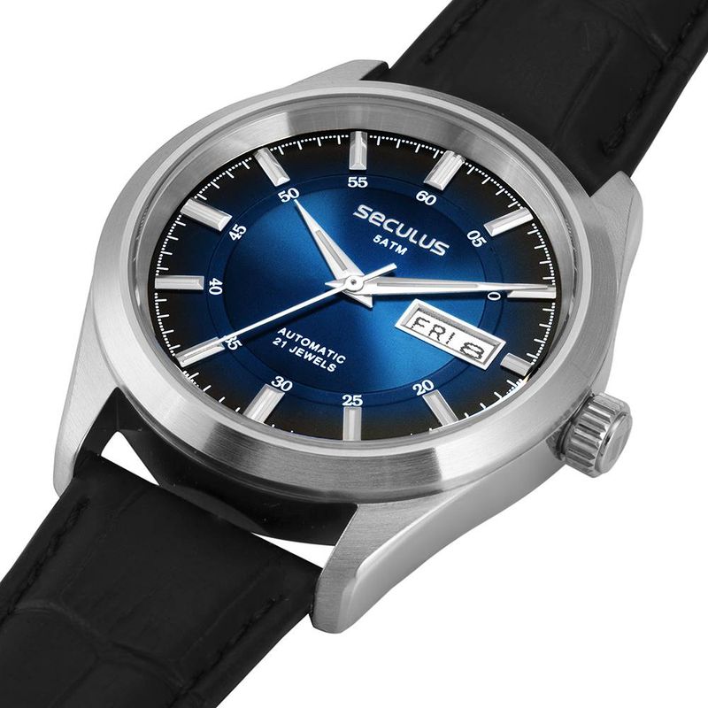 DESCRIÇÃO DO PRODUTO: Vidro: Cristal MineralFunções: Automático, Analógico, Calendário Duplo (Mensal e Semanal em Inglês e Espanhol)Resistencia à água: 50 MCaracterísticas: com caixa de Aço inoxidável e pulseira de Couro Legítimo PretaDiâmetro da caixa: 3,8 cmFundo RosqueadoLinha: Seculus AutomaticAlimentação do Maquinário: Mecânico (Automático, Corda).Mostrador Azul degradêGarantia de 2 anos