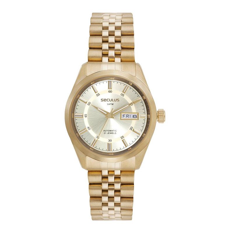 DESCRIÇÃO DO PRODUTO: Vidro: Cristal MineralFunções: Automático, Analógico, Calendário Duplo (Mensal e Semanal em Inglês e Espanhol)Resistencia à água: 50 MCaracterísticas: com caixa de Aço inoxidável e pulseira de Aço InoxidávelDiâmetro da caixa: 3,8 cmFundo RosqueadoLinha: Seculus AutomaticAlimentação do Maquinário: Mecânico (Automático, Corda).Mostrador DouradoGarantia de 2 anos
