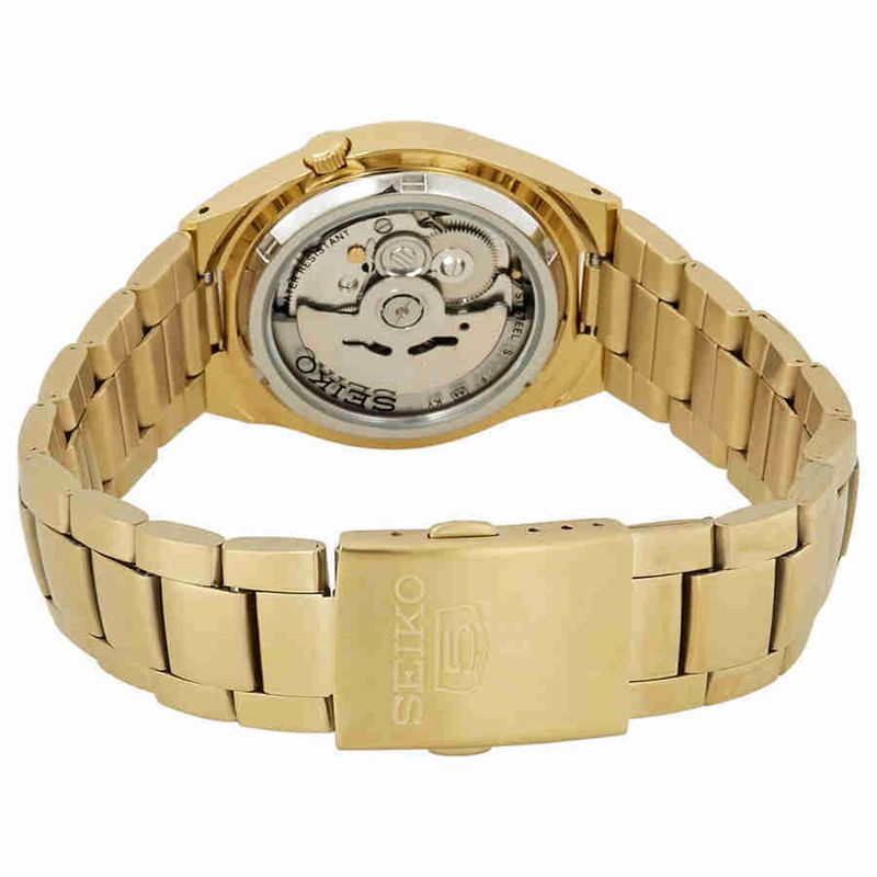 DESCRIÇÃO DO PRODUTO: Vidro: Cristal Mineral Enrijecido (Hardlex)Funções: Analógico, Automático, Calendário Duplo com opção em portuguêsResistencia à água: 30 MCaracterísticas: com caixa Aço inoxidável e pulseira Aço inoxidávelDiâmetro da caixa: 3,7 cmFundo Rosqueado com detalhe de vidro que permite a visualização do maquinárioEstilo: ClássicoMostrador DouradoLinha: Seiko 5 Automatic 21 JewelsAlimentação do Maquinário: Automático (Mecânico)Garantia de 3 Anos