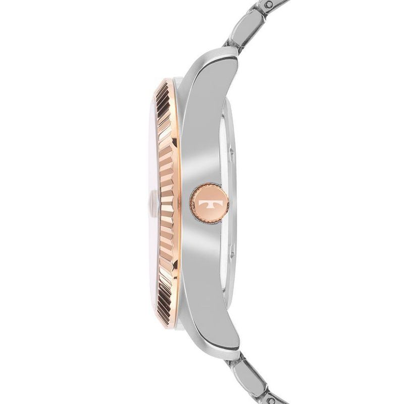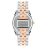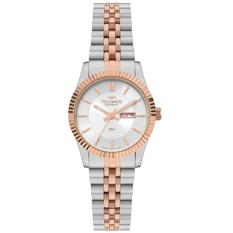 Relógio Technos Feminino Automatico Bicolor - 6t51ad/1kA linha Technos Automático Day-Date apresenta novos modelos femininos que unem tradição e sofisticação em um design clássico. Com maquinismo automático japonês, calibre 6T51, corda manual e por movimentação, reserva de marcha de 40 horas e 21 jewels, é uma coleção que traduz a precisão relojoeira com elegância. O fundo rosqueado de vidro revela o movimento interno, enquanto o aro externo com acabamento corrugado e o mostrador texturizado reforçam o acabamento refinado. Com o toque do calendário day-date e pulseira em aço inoxidável 5 links, a coleção apresenta resistência à água de 50 metros. Além disso, possui tamanho de caixa de 30mm, mostrador champanhe e banho bicolor prata/rose.Cor da Caixa - PrataBanho - BicolorTipo - AutomáticoMaterial da Pulseira - AçoMaterial da Caixa - AçoFormato - RedondoCor do Mostrador - PrataGarantia - 12 mesesCor da Pulseira - BicolorLargura da Caixa (cm) - 3,0Resistência à Água - 5 ATMCor - BicolorTamanho - PequenoGênero - Feminino