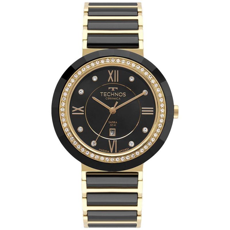 Relógio Technos Feminino Ceramic/saphire Dourado - 2015cej/2p 2015cej/2p modelo em preto da coleção Ceramic, agora com aplicação de pedras cravejadas no aro interno e nos marcadores de diferencial está nos materiais utilizados em sua composição: feito 100% em aço inoxidável, ele apresenta aplicação de cerâmica na pulseira e no aro externo com acabamento facetado, além de possuir Vidro de Safira, ambos altamente resistentes a riscos e arranhões.Produtos com máquina quartz japonesa, calendário e resistência à água de 50m.Banho - DouradoTipo - AnalógicoCor da Caixa - DouradoMaterial da Pulseira - CerâmicaFormato - RedondoCor do Mostrador - PretoTipo de Fecho - Trava LateralGarantia - 12 mesesCor da Pulseira - BicolorLargura da Caixa (cm) - 4,0Resistência à Água - 5 ATMmeli_title - Relógio Feminino Technos Ceramic Saphire Dourado E PretoModelo_ML - 2015CEJ/2P Relógio Technos Feminino Ceramic Dourado com Pulseira de Cerâmica Tela Analógica e Caixa com 40 mm na cor Dourado Fundo Rosqueado à Prova D'água até 50 Metros Presente para Dia dos Pais Mães Namorados NatalCor - DouradoTamanho - MédioGênero - Feminino