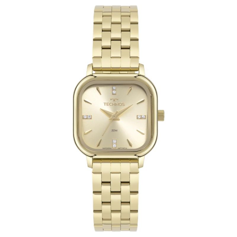 Descrição do Produto: Caixa de Aço InoxPulseira de Aço InoxFundo de PressãoResistente à Água 5 AtmDiâmetro / Largura da Caixa: 26.00 MM x 26.00 MMVidro de Cristal MineralFunções: AnalógicoMaquina JaponesaAlimentação do Maquinário: BateriaMostrador Dourado com pedrasGarantia de 1 Ano