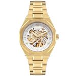 Descrição do Produto: Caixa de AçoPulseira de AçoFundo Rosqueado com detalhe de vidro que permite a visualização do maquinárioResistente à Água 5 AtmDiâmetro / Largura da Caixa: 42.00 MMFunções: Analógico, Automático EsqueletoAlimentação do Maquinário: Automático, CordaMostrador Prateado com detalhe que permite a visualização do maquinárioAro Externo Fixo Exagonal DouradoGarantia de 1 Ano