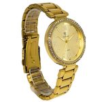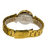 DESCRIÇÃO DO PRODUTO: Funções: AnalógicoResistência à Água: 50mDiâmetro da Caixa: 37 mmCaracterísticas: com caixa em Metal e pulseira em AçoVidro: Cristal MineralFundo RosqueadoAlimentação do maquinário: BateriaMostrador Dourado com NúmerosAro Externo de pedrasMaquinário japonês+ Estojo Porta JóiasGarantia de 1 Ano