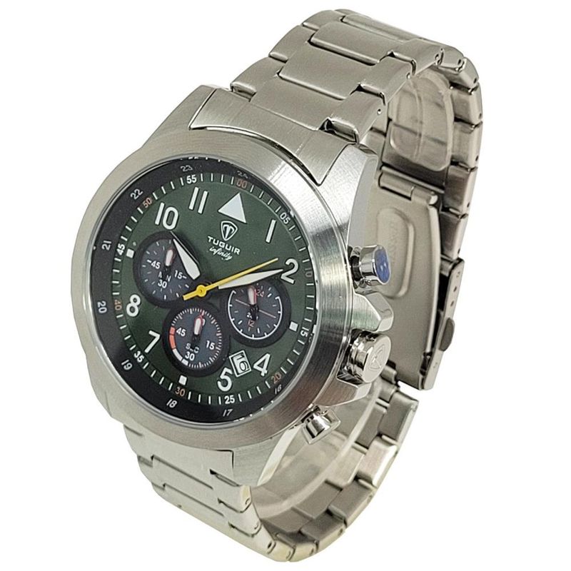 DESCRIÇÃO DO PRODUTO: Funções: Analógico, Cronógrafo, CalendárioResistência à Água: 50mDiâmetro da Caixa: 45 mmCaracterísticas: com caixa em Aço e pulseira em AçoVidro: Cristal MineralFundo RosqueadoAlimentação do maquinário: BateriaMostrador Verde com númerosLinha: Tuguir InfinityGarantia de 1 Ano