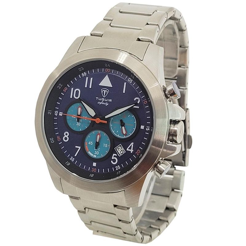 DESCRIÇÃO DO PRODUTO: Funções: Analógico, Cronógrafo, CalendárioResistência à Água: 50mDiâmetro da Caixa: 45 mmCaracterísticas: com caixa em Aço e pulseira em AçoVidro: Cristal MineralFundo RosqueadoAlimentação do maquinário: BateriaMostrador Azul com númerosLinha: Tuguir InfinityGarantia de 1 Ano