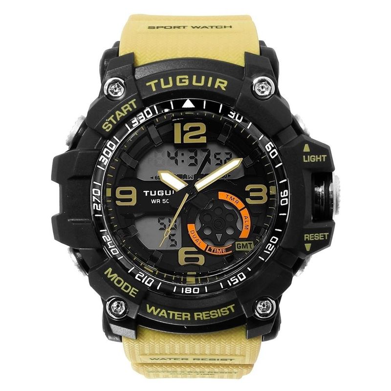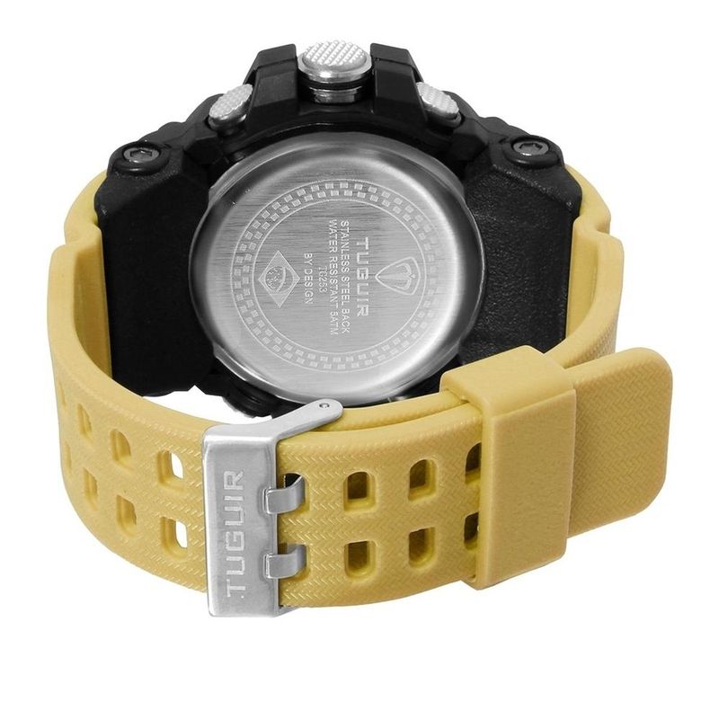 DESCRIÇÃO DO PRODUTO: Funções: Anadigi, Calendário, Iluminação, Alarme, CronógrafoResistência à Água: 50mDiâmetro da Caixa: 54 mmCaracterísticas: com caixa em Policarbonato Preto e pulseira em Poliuretano Cáqui EscuroVidro: AcrílicoFundo ParafusadoAlimentação do maquinário: BateriaMostrador Preto com Detalhes em Cáqui EsuroGarantia de 1 Ano