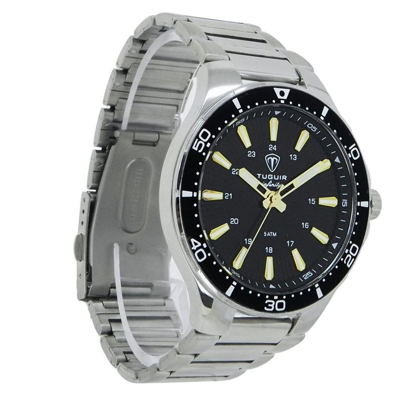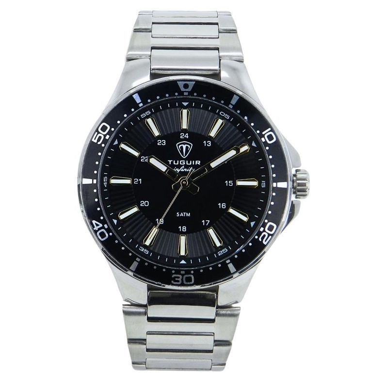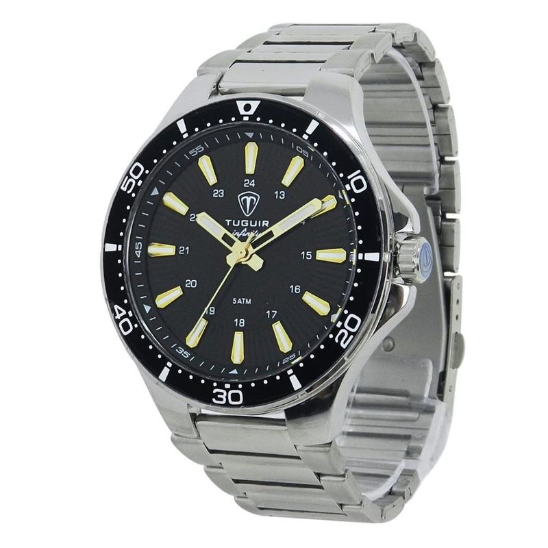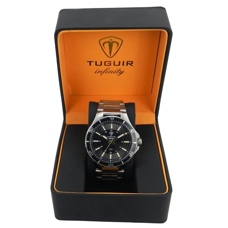 DESCRIÇÃO DO PRODUTO: Funções: AnalógicoResistência à Água: 50mDiâmetro da Caixa: 46 mmCaracterísticas: com caixa em Aço e pulseira em AçoVidro: Cristal MineralFundo RosqueadoAlimentação do maquinário: BateriaMostrador Preto com detalhes em douradoAro Fixo PretoLinha: Tuguir InfinityGarantia de 1 Ano