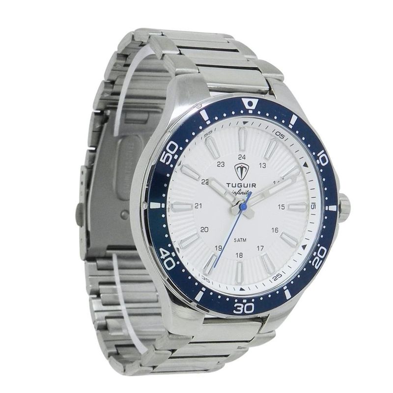 DESCRIÇÃO DO PRODUTO: Funções: AnalógicoResistência à Água: 50mDiâmetro da Caixa: 46 mmCaracterísticas: com caixa em Aço e pulseira em AçoVidro: Cristal MineralFundo RosqueadoAlimentação do maquinário: BateriaMostrador PrateadoAro Fixo AzulLinha: Tuguir InfinityGarantia de 1 Ano