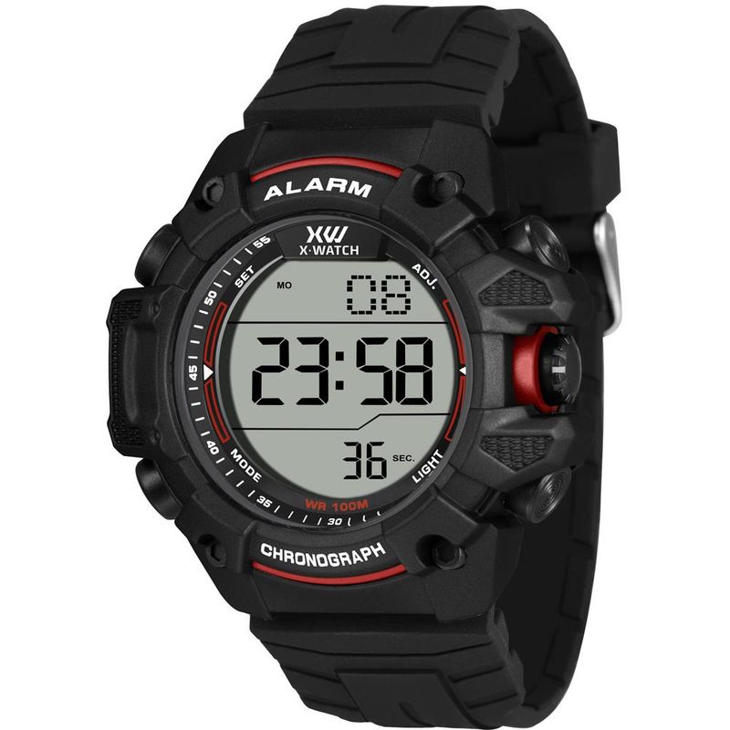 DESCRIÇÃO DO PRODUTO: Funções: Digital, Iluminação, Calendário, Cronógrafo, Alarme, Timer, Dual TimeResistência à Água: 100mDiâmetro da Caixa: 54 mmCaracterísticas: com caixa em Resina Preta e pulseira em Silicone PretaVidro: AcrílicoFundo ParafusadoAlimentação do maquinário: BateriaMostrador Preto com detalhes em branco e vermelhoGarantia de 1 Ano