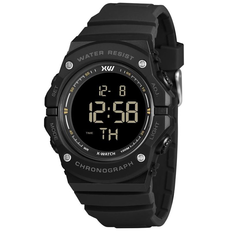 DESCRIÇÃO DO PRODUTO: Funções: Digital, Iluminação, Calendário, Cronógrafo, Alarme, Timer, Dual TimeResistência à Água: 100mDiâmetro da Caixa: 47 mmCaracterísticas: com caixa em Resina Preta e pulseira em Silicone PretaVidro: AcrílicoFundo ParafusadoAlimentação do maquinário: BateriaMostrador Preto com detalhes em branco e douradoGarantia de 1 Ano