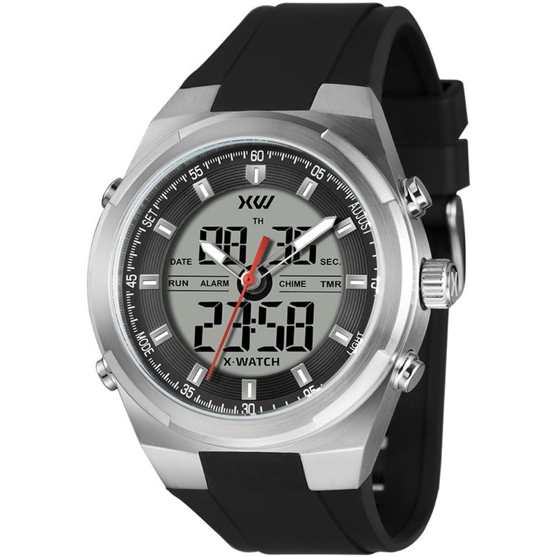 DESCRIÇÃO DO PRODUTO: Visor: LCDFunções: Anadigi, Calendário, Iluminação, Alarme, Cronógrafo, TImer, Dual TimeResistência à Água: 100mDiâmetro da Caixa: 44 mmCaracterísticas: com caixa em Aço e pulseira em Silicone PretaVidro: Cristal MineralFundo RosqueadoAlimentação do maquinário: BateriaMostrador Preto com detalhes em vermelhoGarantia de 1 Ano