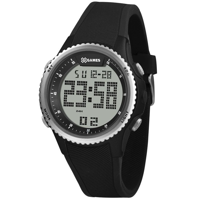 Relógio X-Games Modelo Xmppd607 Bxpx Masculino Digital Tamanho: Padrão Funções - Digital - Luz Noturna verde - Calendário dia do mês e dia da semana - Cronômetro progressivo - Alarme diário - Formato 12/24 hs Características - Bateria - Botões: Simples - Tampa posterior : Parafusada - Resistência à água : 100M - Mostrador Positivo - Material da caixa: Policarbonato preto com aro externo prata - Material da pulseira: Poliuretano Preto Medidas - Diâmetro da caixa : 4,7 cm - Diametro do mostrador: 3,6 cm - Espessura da caixa : 1,5 cm - Largura da pulseira: 2 cm