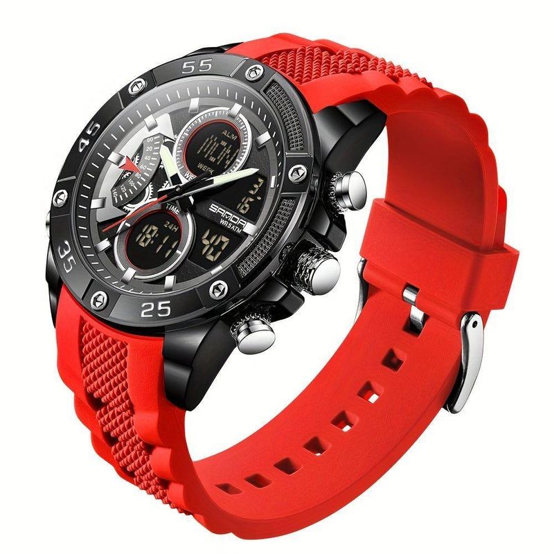 Relógios Em Design De Moda Casuais Da Marca Que São à Prova De água Preto VermelhoDescubra a perfeita fusão entre estilo e funcionalidade com nossos relógios desportivos para homem. Este relógio de design de moda não é apenas um acessório, mas uma extensão do seu estilo de vida ativo. Com um visual sofisticado que se adapta a qualquer ocasião, ele transforma a medição do tempo em uma experiência luxuosa e prática, combinando elementos de moda e utilidade.Perfeito para o moderno, este relógio de negócios casual é à prova de água, oferecendo resistência nas mais diversas situações, enquanto seu movimento de quartzo digital de dupla exibição faz dele uma escolha e duradoura. Usá-lo é explorar um mundo onde inovação e moda andam de mãos dadas, proporcionando um visual e sensação de confiança e inovação. Especificações: [Mestre da Resiliência] O relógio é resistente à água até 5 ATM, garantindo que você possa usá-lo sob chuva ou em atividades aquáticas com tranquilidade. [Mais do que Estilo] Equipado com funções como alarmes de contagem regressiva e cronómetros, este relógio atende a todas as suas necessidades diárias, gerenciando seu tempo com precisão. [Materiais de ] Fabricado com uma correia de gel de sílica e caixa de liga de , sua durabilidade é um dos seus principais atributos. [Configuração Intuitiva] Simples e eletronicamente movido, oferece uma maneira fácil de acessar suas funções, complementando seu estilo de vida descomplicado. [Organização ao seu Alcance] Com um mostrador redondo e exibição de data, dias da semana e hora, ele organiza suas informações diárias de forma clara e acessível.