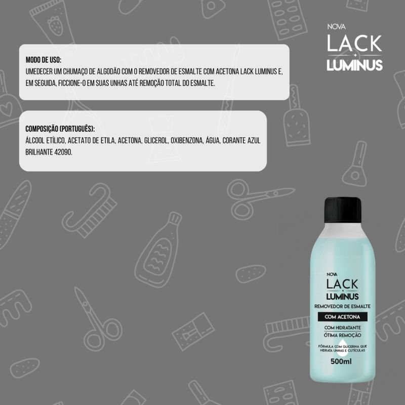 Removedor de Esmalte Lack Luminus Com Acetona 500ml Alta eficiência na remoção do esmalte, ideal para uso profissional e frequente. O Removedor de Esmalte Lack Luminus Com Acetona 500ml foi desenvolvido para garantir remoção rápida e eficaz de esmaltes tradicionais, cintilantes, cremosos e escuros. Sua fórmula com acetona proporciona ação potente, reduzindo o tempo de remoção e facilitando a rotina de cuidados com as unhas, sendo muito utilizado em salões de beleza e também no uso doméstico. O que é e para que serve o Removedor de Esmalte Lack Luminus Com Acetona? O Removedor de Esmalte Lack Luminus Com Acetona é um produto cosmético de uso externo indicado para remover esmaltes com rapidez e eficiência. Sua ação intensa facilita a limpeza completa das unhas, preparando-as para uma nova esmaltação ou tratamento. Benefícios e Diferenciais Remove o esmalte de forma rápida e eficaz; Fórmula com acetona para alto poder de limpeza; Ideal para esmaltes escuros, cintilantes e de difícil remoção; Reduz o tempo de remoção; Indicado para uso profissional e doméstico; Embalagem econômica de 500ml; Facilita a preparação das unhas para nova esmaltação. Principais Características Com Acetona: Ação potente e rápida; Alto Rendimento: Ideal para uso frequente; Uso Profissional: Muito utilizado em salões de beleza; Eficiência Comprovada: Remove o esmalte sem esforço excessivo. Confira a composição completa na embalagem do produto. Modo de Uso Umedeça um algodão com o Removedor de Esmalte Lack Luminus Com Acetona; Aplique sobre a unha; Pressione levemente e deslize até remover o esmalte; Repita se necessário; Lave e hidrate as mãos após o uso. Advertências Uso externo; Manter fora do alcance de crianças; Evitar contato com os olhos; Em caso de contato com os olhos, enxaguar abundantemente; Não ingerir; Produto inflamável: manter longe do fogo e fontes de calor; Utilizar em local ventilado; Armazenar em local fresco, seco e ao abrigo da luz. Indicação de Uso O Removedor de Esmalte Lack Luminus Com Acetona 500ml é indicado para quem busca remoção rápida, prática e eficiente, especialmente em rotinas intensas de esmaltação, sendo ideal para profissionais de manicure e pedicure ou para quem utiliza esmaltes com frequência.