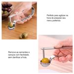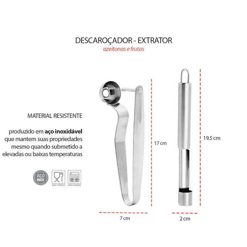 Descaroçador de azeitonas e extrator de polpa. Utensilios diferenciados que geram praticidade e torna a execucao dos seus pratos favoritos ainda mais saborosos. Ideal para remover sementes e caroços das frutas. Nao solta nenhum residuo nos alimentos, e traz muito mais resistencia. Produzido em aço inox pode ser levado a maquina lava-louças, sem comprometer a qualidade do produto. Altamente duravel, mantem suas caracteristicas originais, preservando a beleza, a higiene e a durabilidade do material. Contem: 1 Extrator de Caroço Dimensao: 17 x 7 cm Peso: 90 gramas 1 Extrato de Polpa Dimensao: 19,5 x 2 cm Peso: 55 gramas Material: Aço inoxidavel CASACHA é uma empresa especializada em utensilios de cozinha e aventais profissionais.